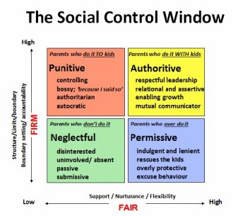 A helpful way to think about how our kids experience our parenting style - how we lead and use authority - is to use the Social Control Window (McCold and Wachtell, adapted from Glaser, 1969).It offers two broad styles of 'parenting' or 'being in authority'.