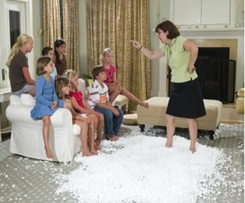 Oh, come on... I can't believe this. This makes my blood boil! What were you thinking? You weren't thinking at all! Were you? Were you? Look at my beanbag, you've wrecked it and look at the mess all over the floor! Oh yes, you'll clean up every last bit by hand - not with my vacuum cleaner. How many times have I told you not to hit each other with the beanbag? How many times have I caught you doing this before? I've been over this so many times; over and over and over it. What more can I say? It's as if you don't hear me, don't respect our things and don't care. I asked all of you to be good while I was away for those few minutes. I may as well have saved my voice! You don't listen - you never do! Abby, what were you doing when this happened? You know I rely on you. I'm so disappointed. You're grounded!/